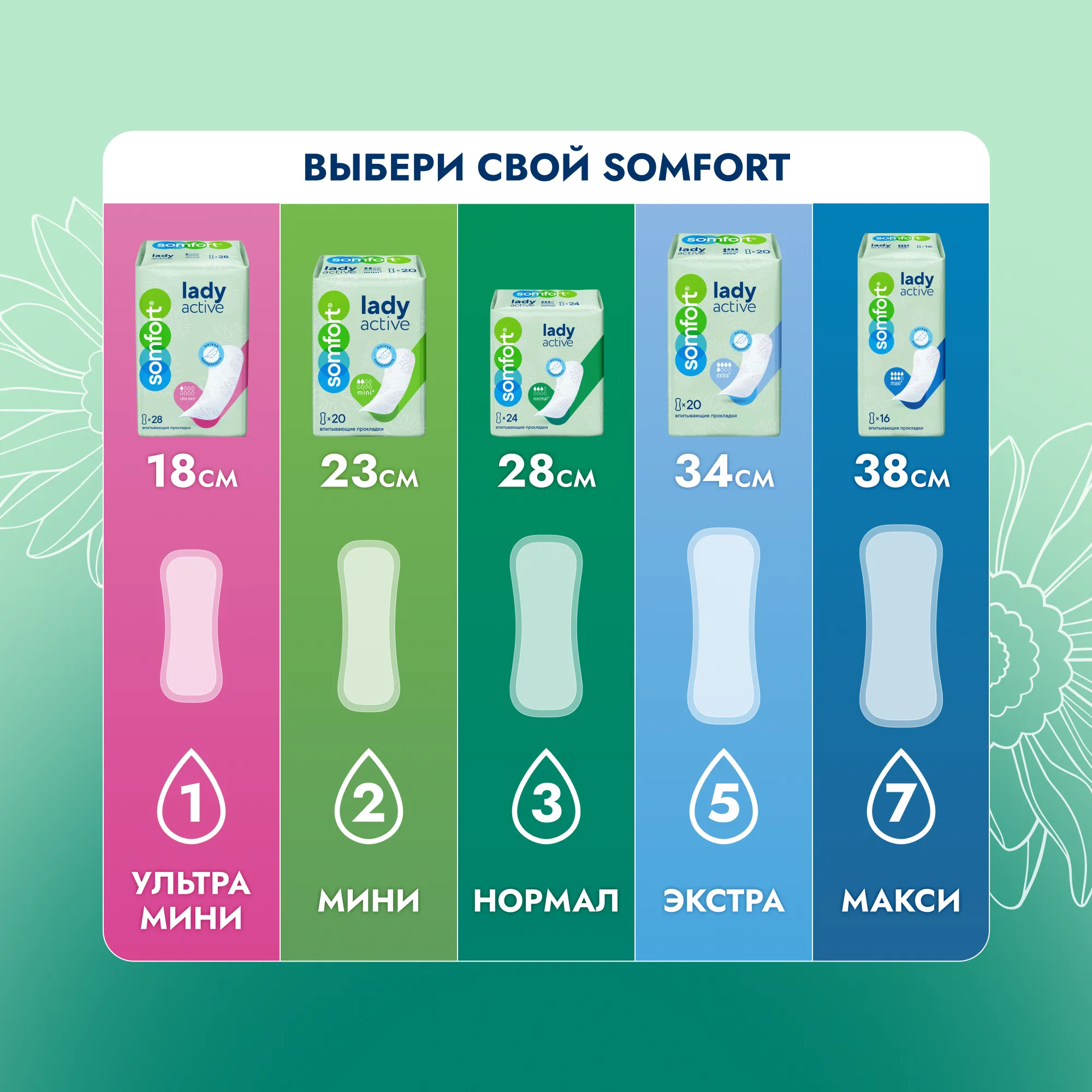 Somfort Lady Active Normal (Сомфорт Леди Актив Нормал) — надежные впитывающие прокладки, созданные для защиты при недержании легкой степени. Благодаря гранулам суперабсорбента в составе впитывающего слоя быстро поглощают влагу, удерживая ее внутри прокладки, и нейтрализуют запах. Мягкие эластичные резиночки по бокам поддерживают форму прокладки и обеспечивают дополнительную защиту от протеканий. Мягкая поверхность дарит ощущение комфорта.